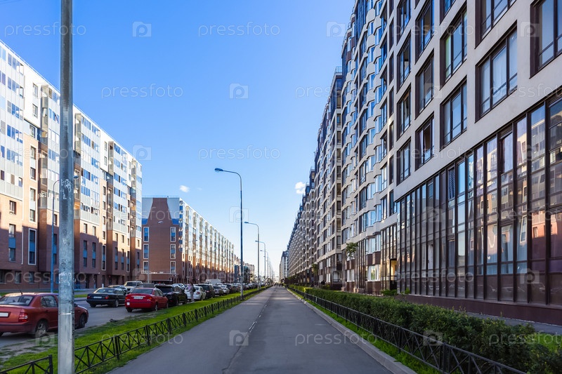 Городская улица с многоэтажными домами и тротуаром