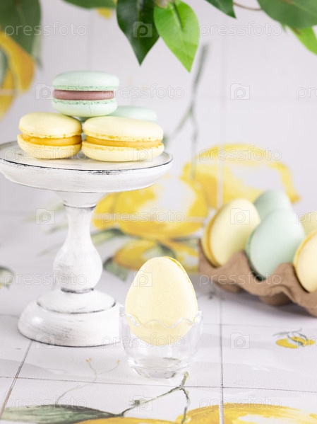 Макарунсы в виде яиц на столе в плошке и на подставке