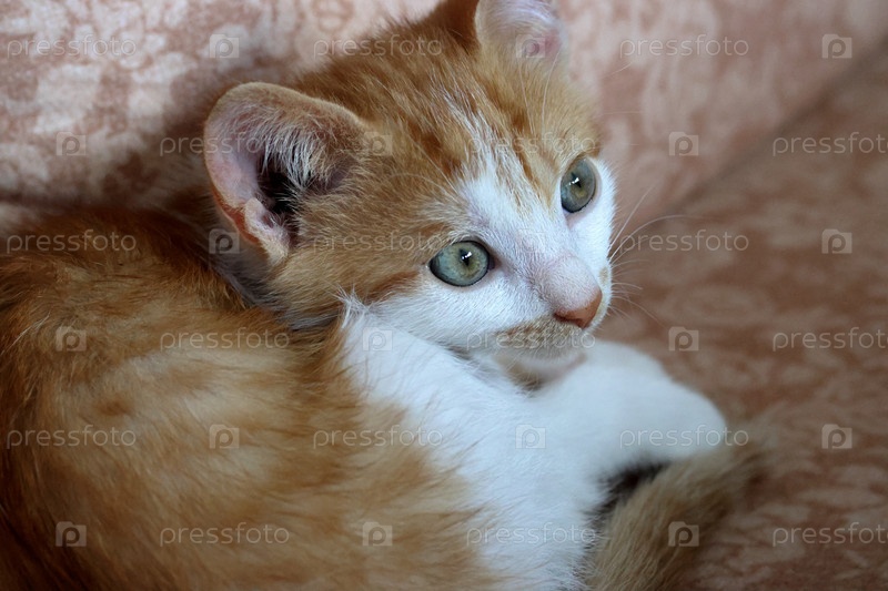 Маленький котенок. На нем ошейник с колокольчиком. Окрас котенка рыжий с белым. Лежа на диване