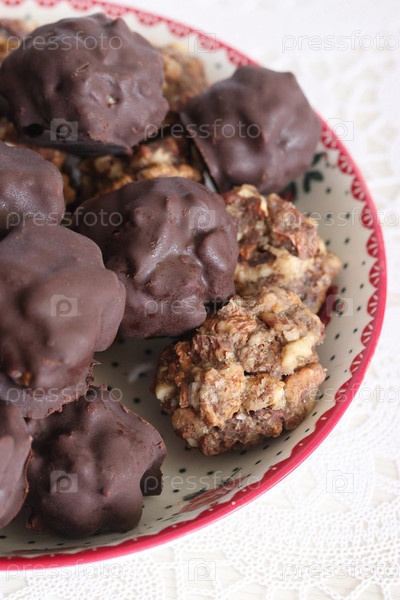Домашние конфеты из орехов и сухофруктов. Некоторые покрыты шоколадом. Они лежат на тарелке. Крупный план