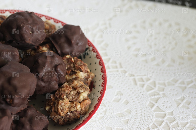 Домашние конфеты из орехов и сухофруктов. Некоторые покрыты шоколадом. Они лежат на тарелке
