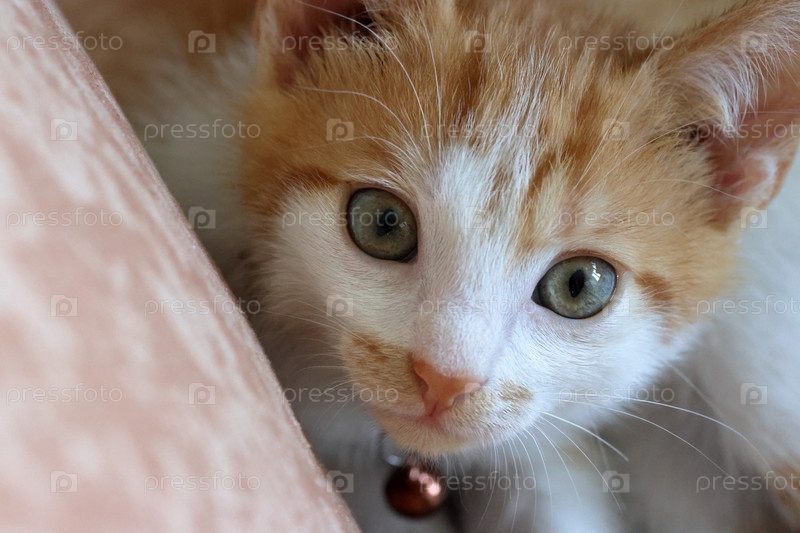 Маленький котенок. На нем ошейник с колокольчиком. Окрас котенка рыжий с белым. Смотрит
