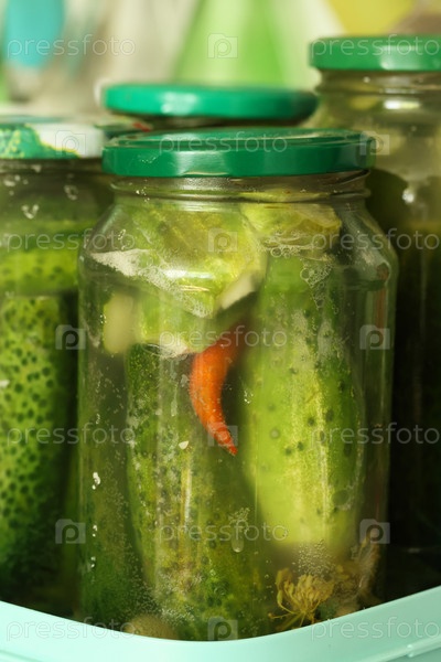 Огурцы в стеклянных банках, залитых рассолом. Заготовка огурцов на зиму