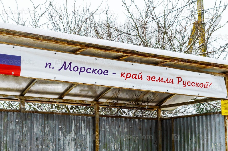 Перевод на русский язык: Село Морское - край земли русской. Баннер на автобусной остановке