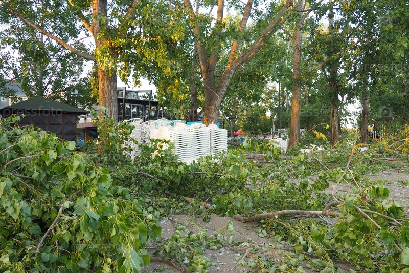 Последствия урагана 19 июля 2023 г. Сремска-Митровица, Сербия. Сломанные деревья, бардак на улицах. Сломанные ветки, погнутые стволы. Чипсы и мусор. Чрезвычайное положение после катастрофического шторма