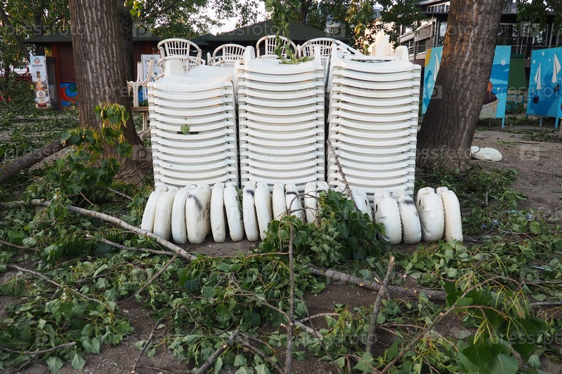 Последствия урагана 19 июля 2023 г. Сремска-Митровица, Сербия. Сломанные деревья, бардак на улицах. Сломанные ветки, погнутые стволы. Чипсы и мусор. Чрезвычайное положение после катастрофического шторма