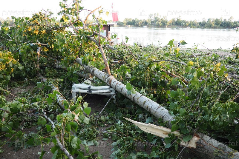 Последствия урагана 19 июля 2023 года, пляж Сремска-Митровица, Сербия. Сломанные деревья, бардак на улицах. Сломанные ветки, погнутый ствол. Чипсы и мусор. Чрезвычайное положение после катастрофического шторма