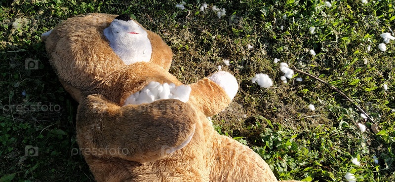 Ненужная забытая игрушка на траве. Порванный плюшевый мишка лежит на земле. Концепция насилия и забывчивости. Из груди медведя видна белая вата. Наполнитель вокруг игрушки