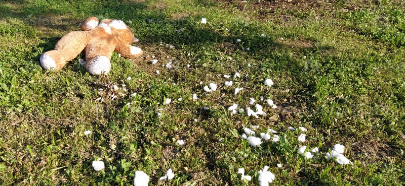 Ненужная забытая игрушка на траве. Порванный плюшевый мишка лежит на земле. Концепция насилия и забывчивости. Из груди медведя видна белая вата. Наполнитель вокруг игрушки