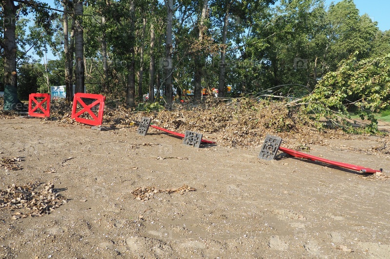 Последствия урагана 19 июля 2023 г. Сремска-Митровица, Сербия. Последствия сверхъячейкового мезоциклона. Сломанные деревья и ветки, беспорядок на пляже. Упавшие пластиковые заборы, ограничители, мобильные заборы