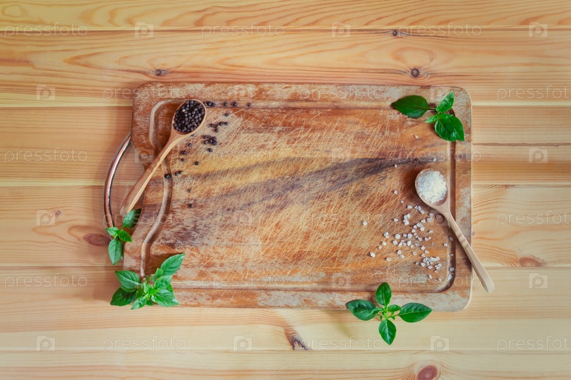 Пустая деревянная разделочная доска, приправы и зеленый базилик на деревенском деревянном фоне. Вид сверху, пространство для копирования
