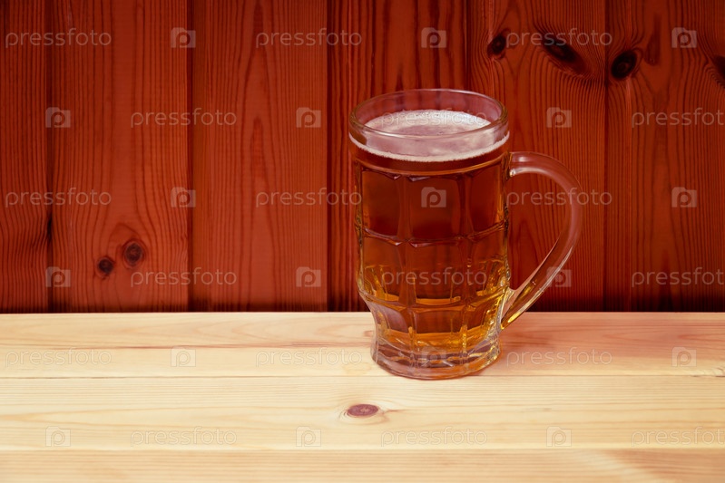 Пивная кружка на деревянном столе. Просмотр с копией пространства