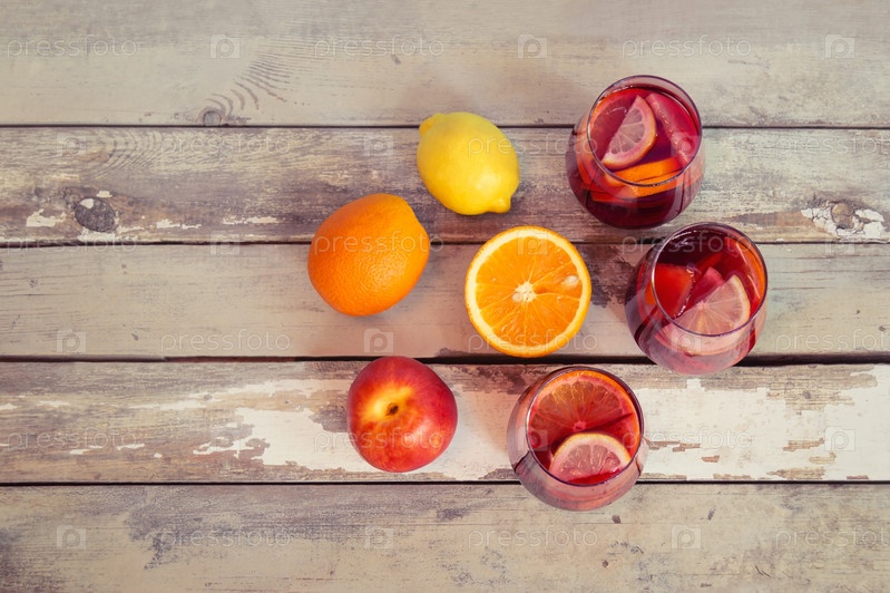 Сангрия красного вина с фруктами в стаканах и свежими фруктами рядом на старом деревянном фоне. Скопируйте пространство, вид сверху