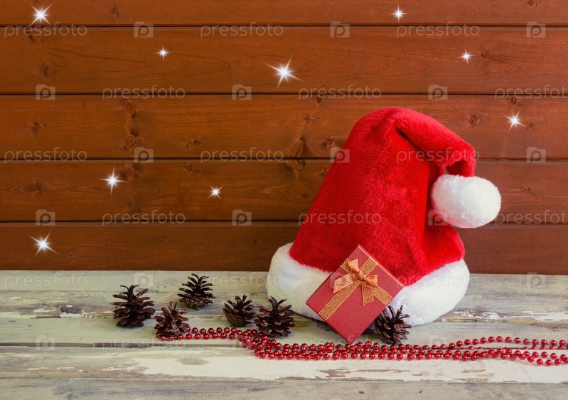 Пушистая шляпа Санты с сосновыми шишками и рождественским подарком на старом деревянном столе возле деревянной стены. Просмотр с копией пространства