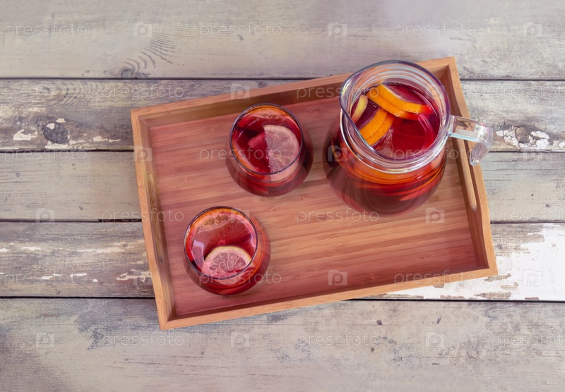 Сангрия красного вина с фруктами в стаканах и кувшине на деревянном подносе на деревенском деревянном столе. Выборочный фокус