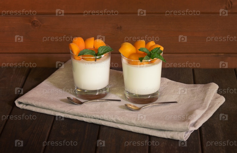 Домашняя вкусная итальянская десертная панна котта со свежими абрикосами подается в маленьких прозрачных стаканах. Выборочный фокус