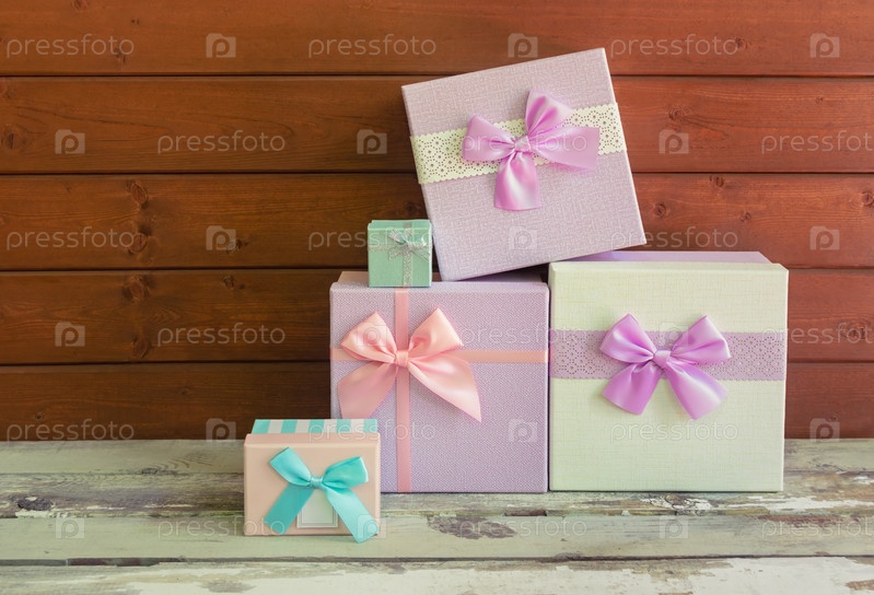 Подарки на деревянном фоне. Просмотр с копией пространства