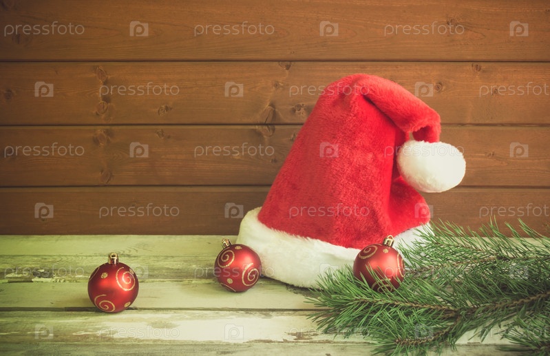 Пушистая шляпа Санты, елочные шары и сосновые ветки на состаренном деревянном столе. Тонированное изображение. Винтажный стиль