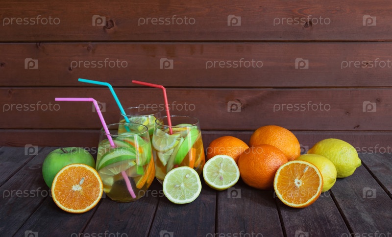 Три стакана сангрии из белого вина с фруктами и свежими фруктами рядом