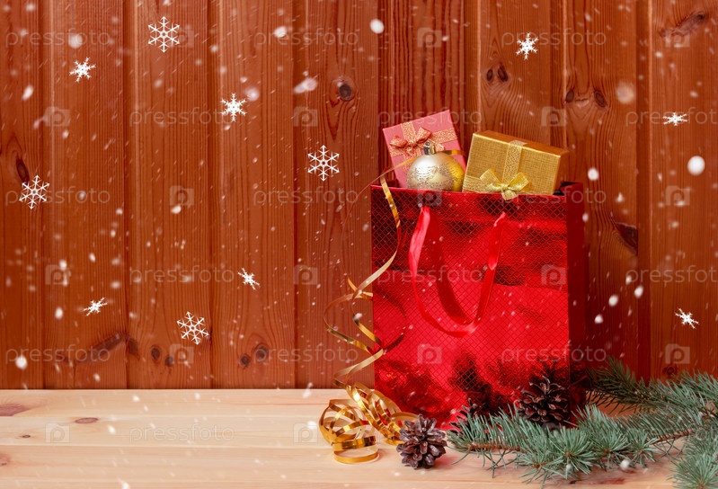 Блестящая красная сумка с подарками. Концепция рождественских покупок. Просмотр с копией пространства