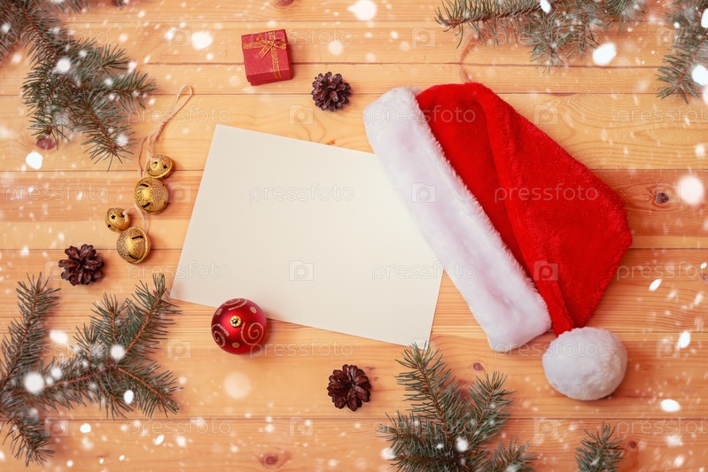 Пушистая шляпа Санты, пустая карточка для текста, рождественские украшения и еловые ветки на деревянном фоне. Вид сверху, пространство для копирования