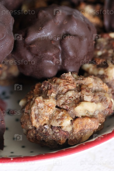 Домашние конфеты из орехов и сухофруктов. Некоторые покрыты шоколадом. Они лежат на тарелке. Крупный план