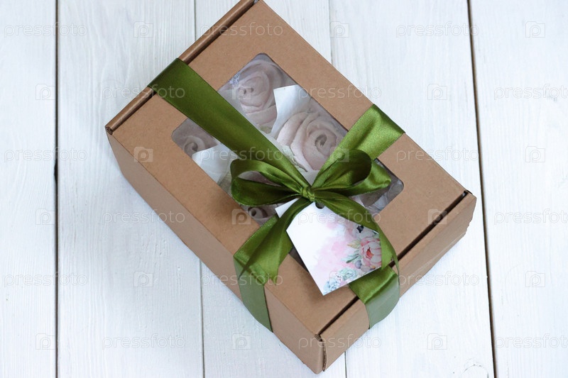 Домашний зефир в бумажной подарочной упаковке. Зефир цветы. Коробка перевязана лентой, завязанной на бантик