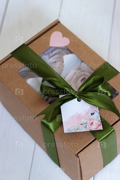 Домашний зефир в бумажной подарочной упаковке. Зефир цветы. Коробка перевязана лентой, завязанной на бантик