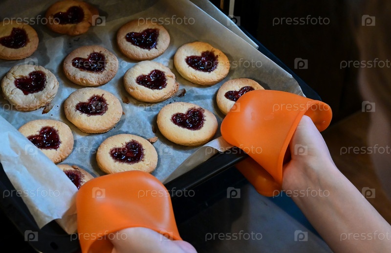 Женщина ставит в духовку противень с вкусным домашним печеньем в форме сердца. Концепция свежей домашней выпечки или сюрприз на День святого Валентина, День матери