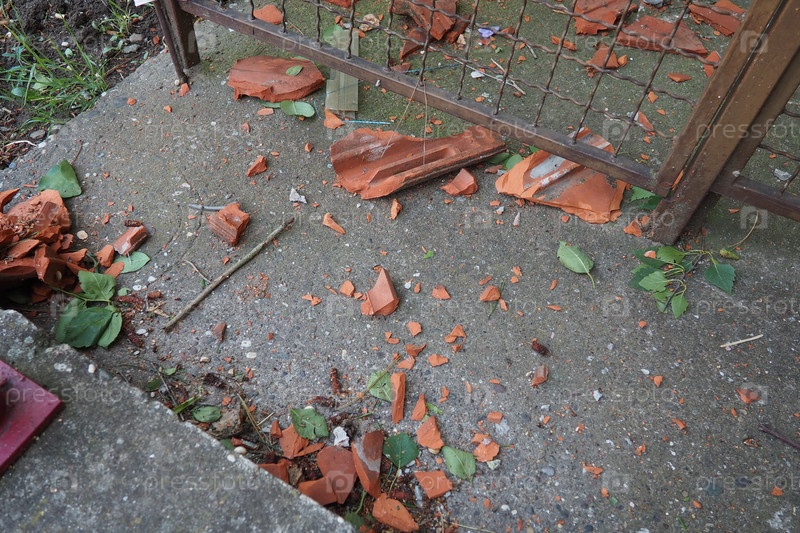 Последствия урагана 07,19,23 Сремска-Митровица, Сербия. На мостовой осколки кирпича и керамической черепицы, упавшие с крыш. Чрезвычайное положение после катастрофического шторма