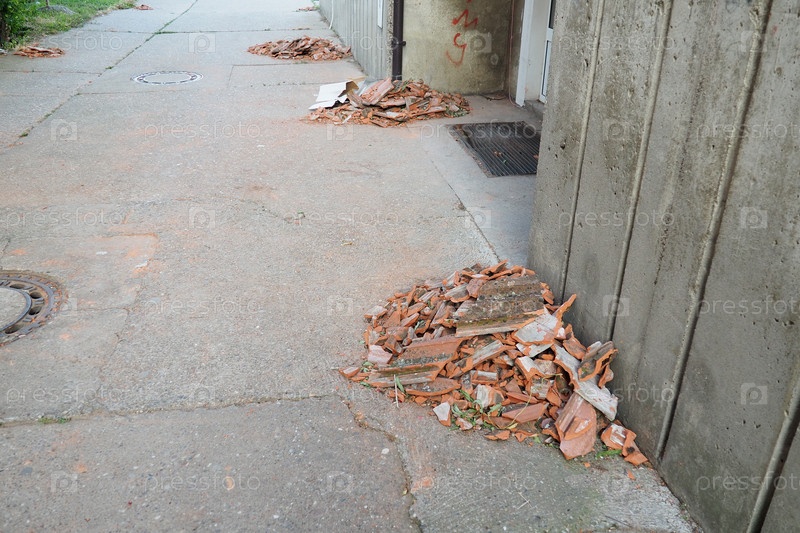 Последствия урагана 07,19,23 Сремска-Митровица, Сербия. На мостовой осколки кирпича и керамической черепицы, упавшие с крыш. Чрезвычайное положение после катастрофического шторма