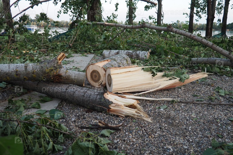 Последствия урагана 19 июля 2023 года, пляж Сремска-Митровица, Сербия. Сломанные деревья, бардак на улицах. Сломанные ветки, погнутый ствол. Чипсы и мусор. Чрезвычайное положение после катастрофического шторма