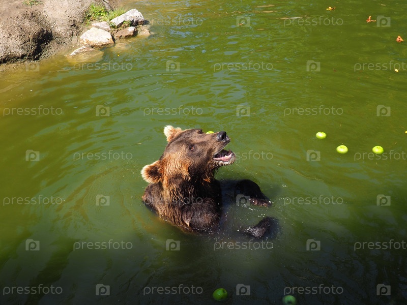 Мокрый медведь в воде ест зеленые яблоки. Евразийский коричневый медведь Ursus arctos arctos распространенный подвид коричневого медведя в Евразии. Животный опасный лесной хищник. Фруктовый завтрак у бассейна