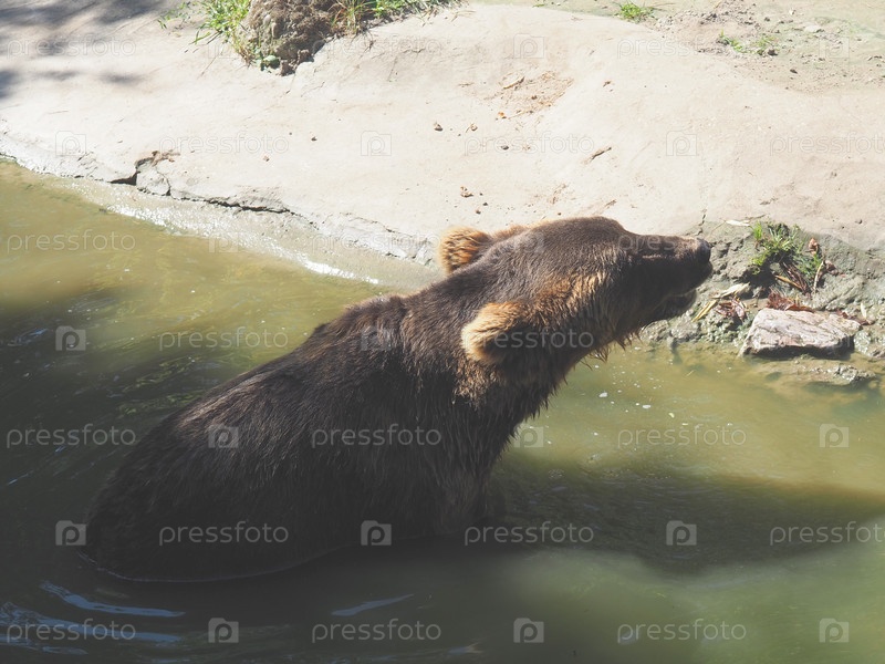 Евразийский бурый медведь Ursus arctos arctos распространенный подвид коричневого медведя в Евразии. Животное опасный лесной хищник. Медведь плавает в зеленой воде. Мокрый медведь в пруду
