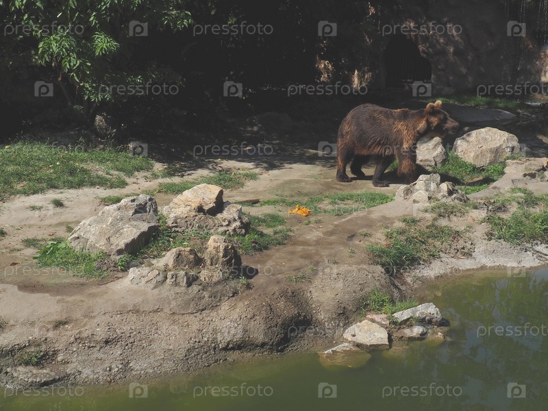 Евразийский бурый медведь Ursus arctos является распространенным подвидом коричневого медведя в Евразии.Медведь ходит по каменистому берегу пруда, осматривая свою территорию.Опасный лесной хищник