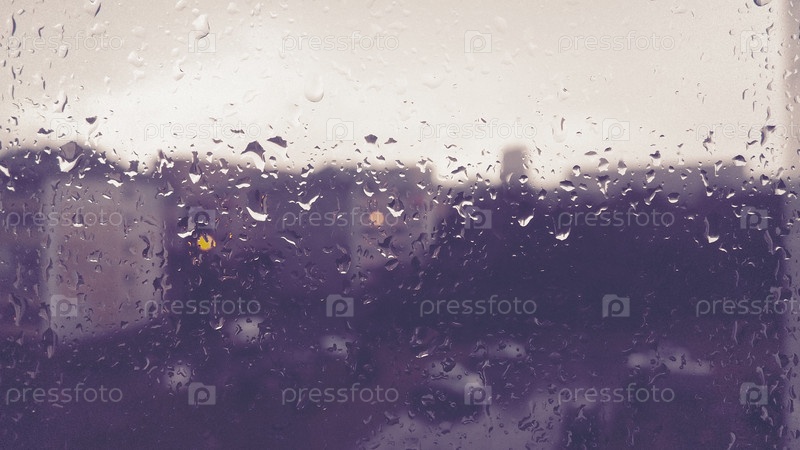 Плохая погода в городе. Здания, дома, машины за окном. Облачность кучевые облака. Метеорология и прогноз погоды. Капли дождя стекают по стеклу. Буря и буря и ветер на улице города