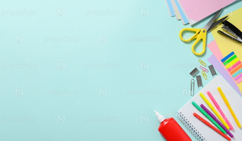 Вернуться к школьной концепции. Канцтовары для школы на синем фоне. Вид сверху, пустое рекламное место слева