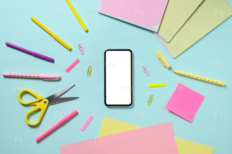 Смартфон с пустым белым дисплеем и множеством канцелярских товаров на синем фоне. Концепция интернет-магазина подготовки к школе. Вид сверху