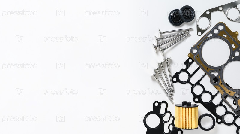 Плоская укладка. Новые автозапчасти на белом фоне. Скопируйте пространство. Магазин автозапчастей