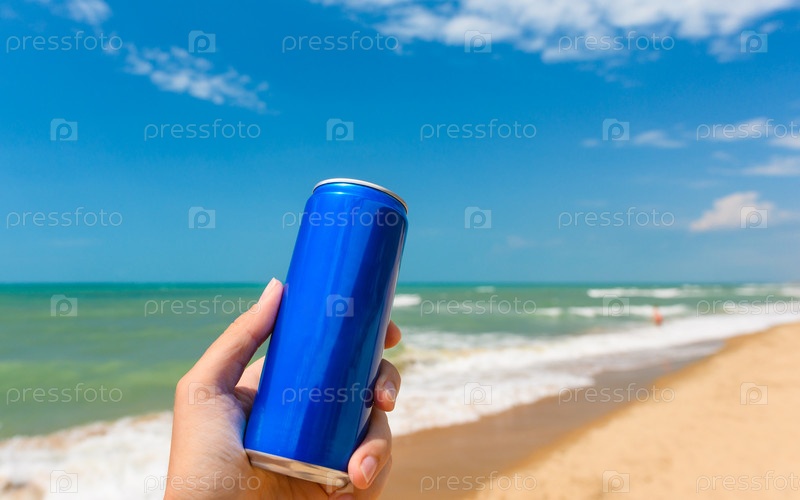 Баночка с холодным напитком в руке на фоне морского берега. Крупный план