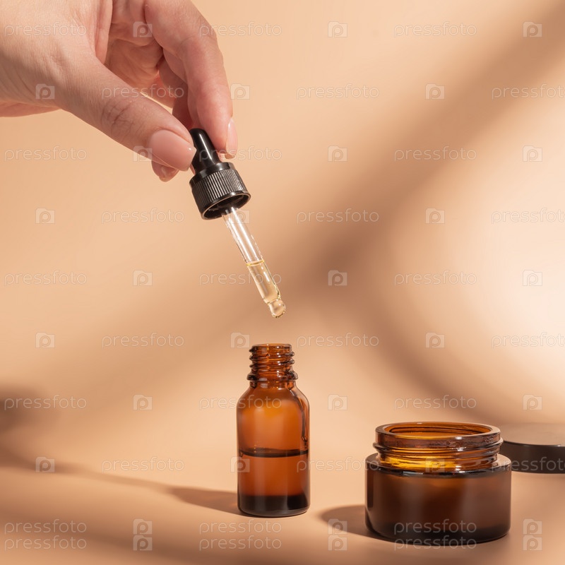 Женская рука с капельницей эфирного масла, эссенцией ароматерапии или лекарственной жидкостью на бежевом фоне. Модный дизайн жестких теней