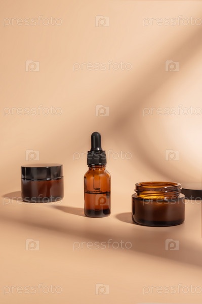 Упаковка косметики. Набор различных косметических флаконов крема или сыворотки на бежевом фоне. Пустая упаковка. Концепция продукта спа-салона природной красоты. Красота. Макет
