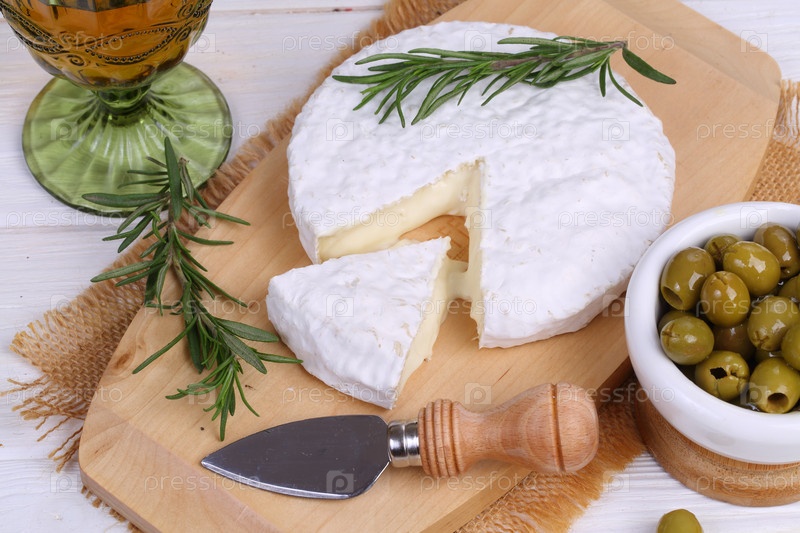 Камамбер с оливками на деревянном столе