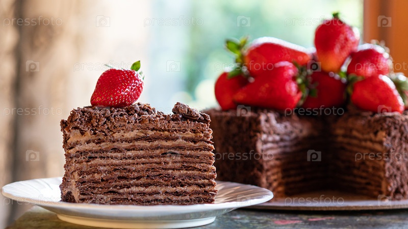 Кусок шоколадного торта с клубникой