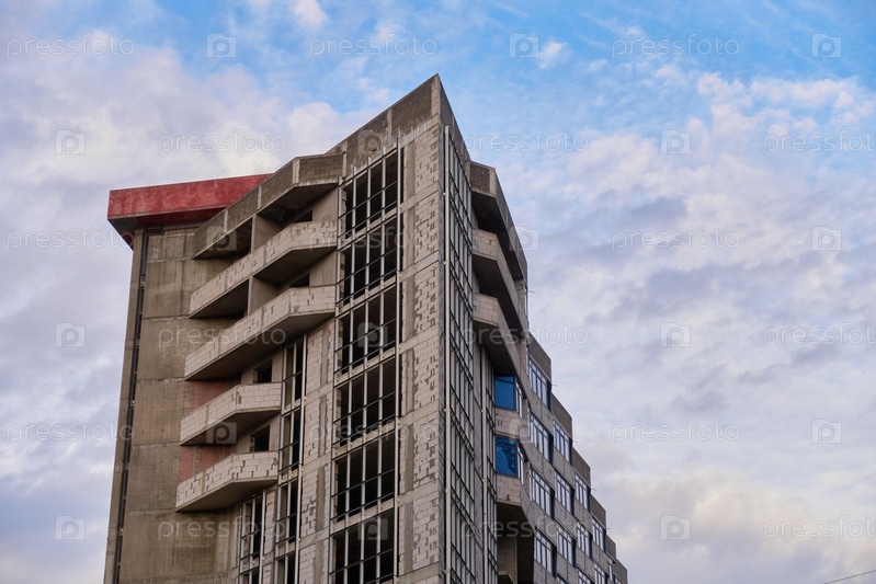 Строящийся многоквартирный дом из кирпича и монолита. Бетонная конструкция с балконами и оконными проемами. Голубое облачное небо
