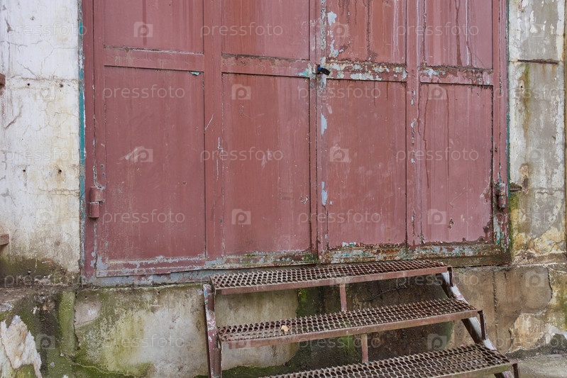 Старые ржавые коричневые ворота. Облупившаяся заплесневелая штукатурка на стене. Ржавые металлические ступеньки к двери
