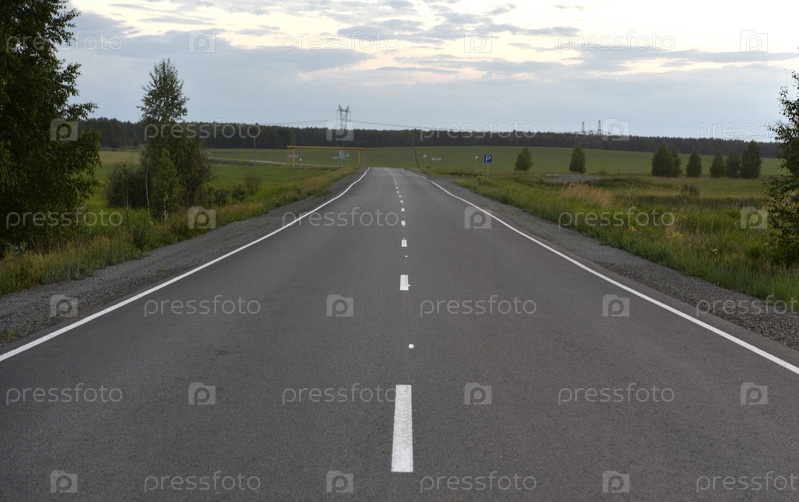 Асфальтовая скоростная дорога летом в деревне. Дорога вечером
