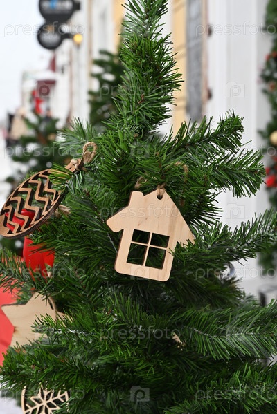 Елка на улице, украшенная елочными игрушками. Украшение к Новому году и Рождеству