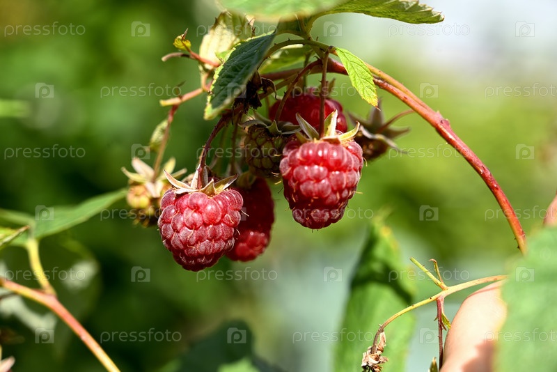 Красная малина в саду крупным планом. Большая ягода спелой малины в саду. Красные сладкие ягоды, растущие на кусте малины в саду