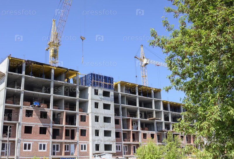 Башенные краны и недостроенные здания на фоне голубого неба с белыми облаками. Жилищное строительство, многоквартирные дома в городе